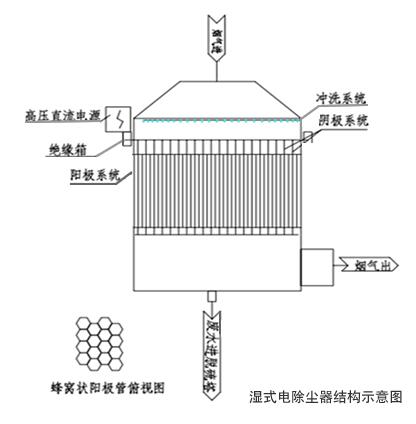 濕電有幾種結構形式,一種是使用耐腐蝕導電材料(可以為導電性能優良的的非金屬材料或具有耐腐蝕特性的金屬材料)做集塵極,一種是用通過噴水或溢流水形成導電水膜不導電的非金屬材料做集塵極。 濕式電除塵器還可分為橫流式(臥式)和豎流式(立式),橫流式多為板式結構,氣體流向為水平方向進出,結構類似干式電除塵器;豎流式多為管式機構,氣體流向為垂直方向進出。一般來講,同等通氣截面積情況下豎流式濕式電除塵器效率為橫流式的2倍。