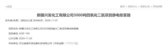 威美環保中標新疆興發3000噸四氧化二氮項目靜電除霧器