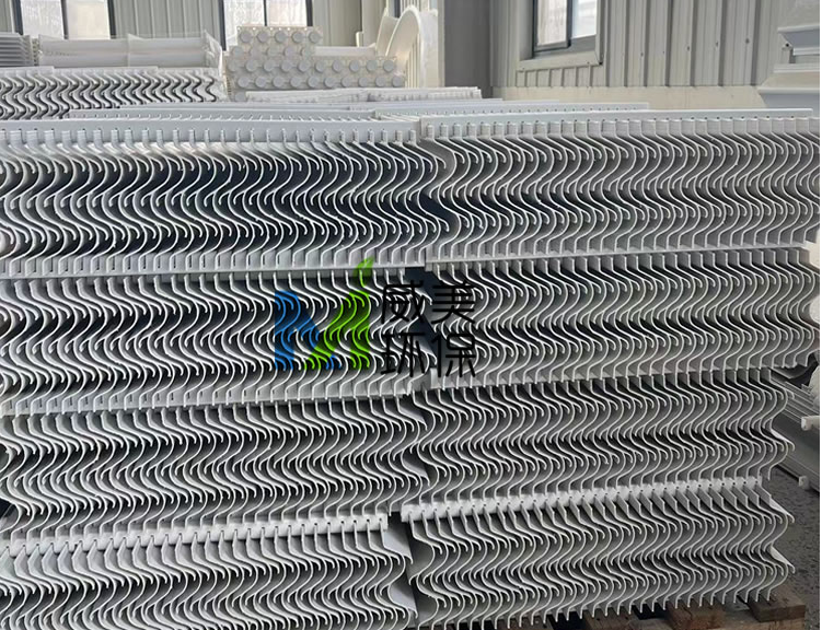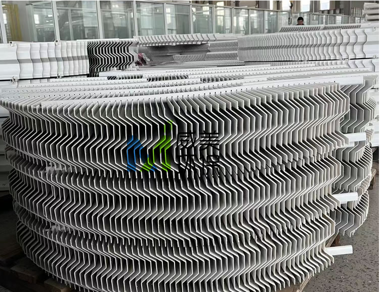 平板式除霧器適用于中、低氣速的吸收塔,主要用于氣體和流體的分離,一般被裝在吸收塔的頂部,可以很好去除3-5μm的霧滴,其分離出來的液滴直接落入吸收塔內的漿液池中。根據性能要求,平板式除霧器可以用于一層或者多層系統,并且可以加裝在線沖洗系統,另外平板式除霧器也可以配合濕電靜電除霧器、管束除塵除霧器等設備使用。