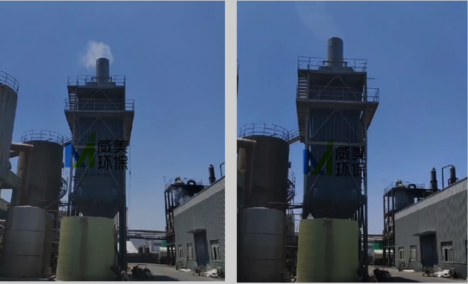 第一臺焦亞硫酸鈉尾氣治理現(xiàn)場效果圖,濕電除霧器恒流電源開機(jī)加檔后,效果非常顯著,下面是開機(jī)前后的對比效果
